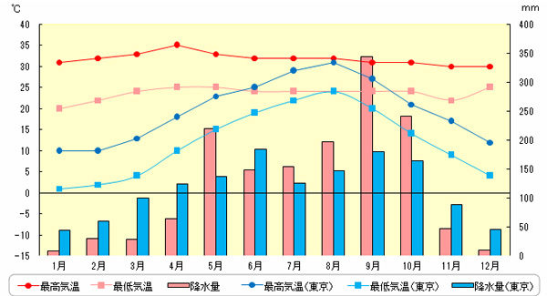 雨季は9月~12月だが気温の関係で泳ぐのに最適なのは4月下旬~8月。6月~8月は雨量少ないが湿度が高く蒸し暑い。8月下旬~10月は台風のリスクあり。